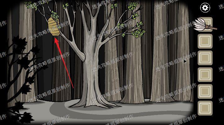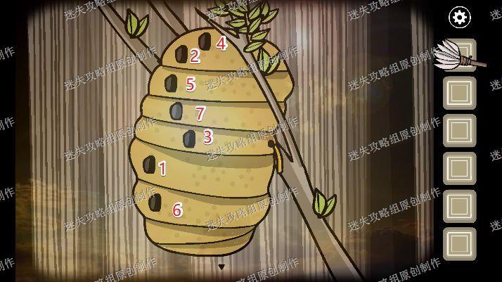 21.我们调查门口左边的石头,拿到苍蝇拍,沿着小路进入森林里,点击马蜂窝,要按顺序点,如图点击,连续点击七次,拿到蜂蜜。