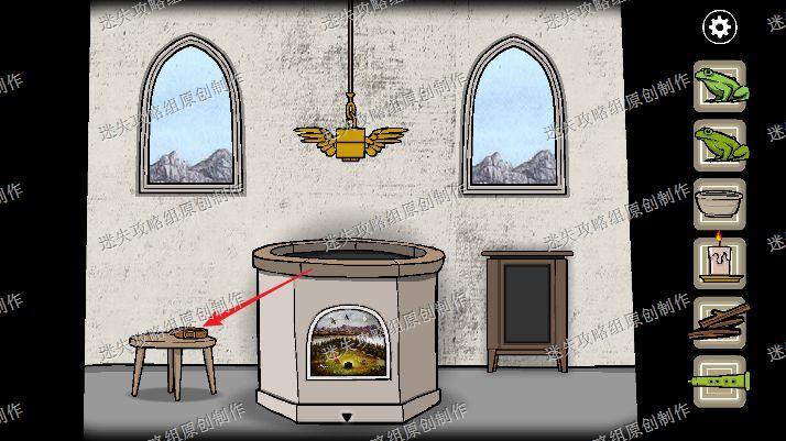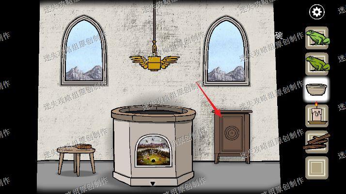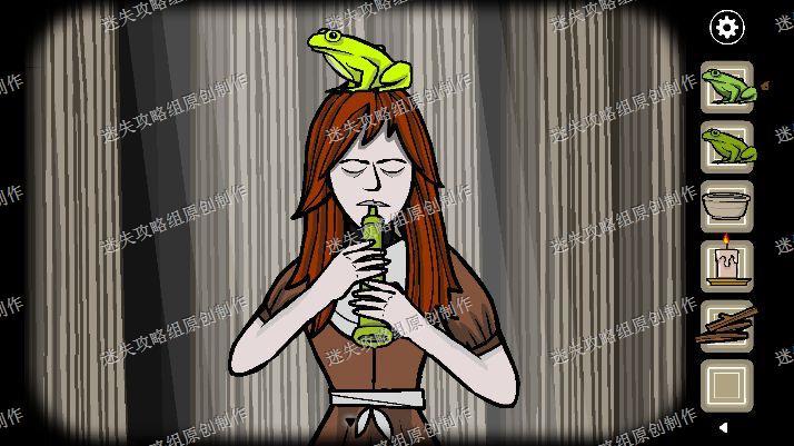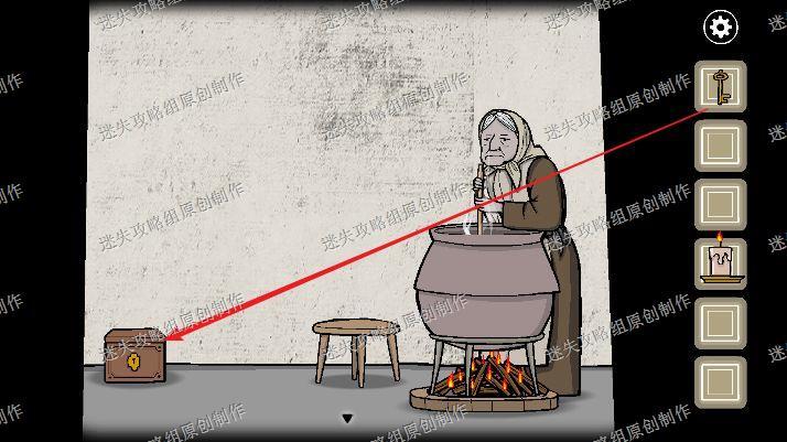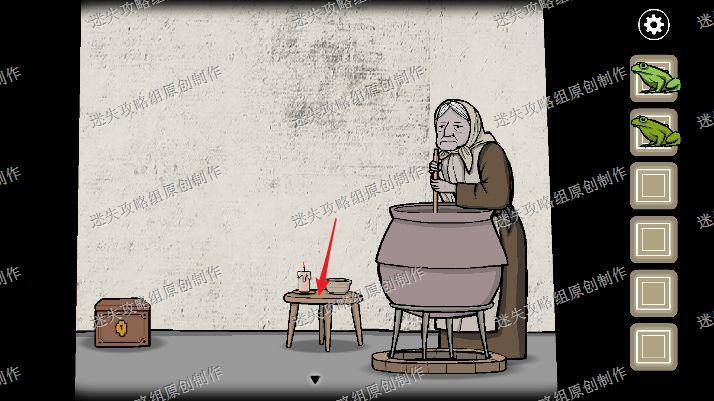 19.进到小屋子离去,把四只青蛙放入锅中,底下家柴用蜡烛点燃,获得一碗青蛙汤,来到开始进去的地方,把青蛙汤给他喝,拿到钥匙。