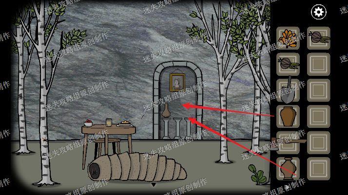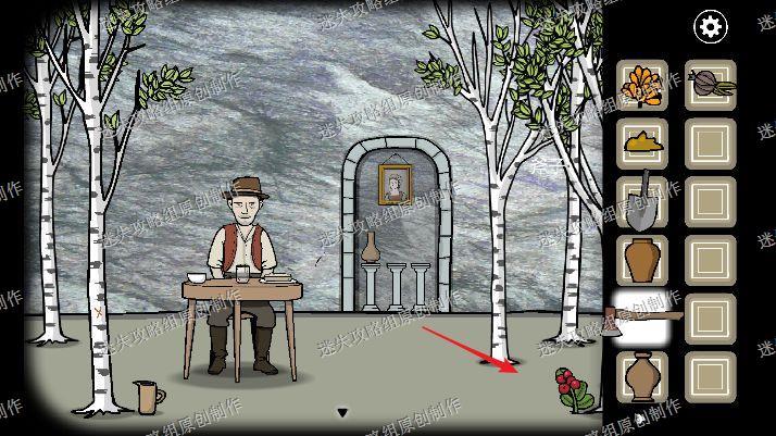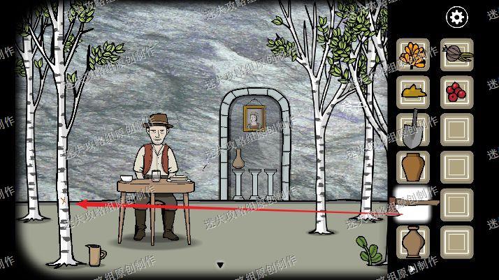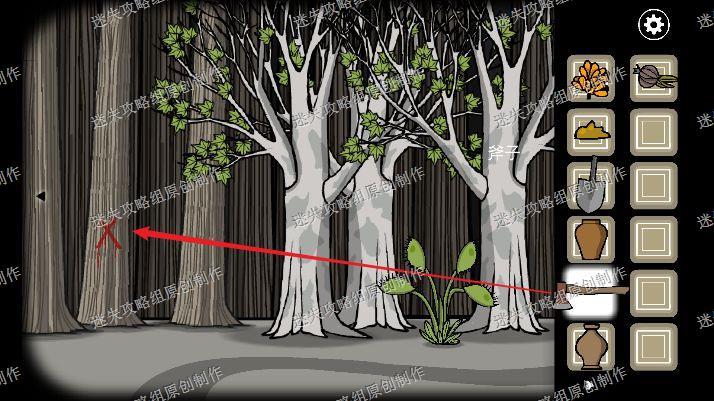 28.去到房子里,在右边的模具制作台上捏出了壶子,回到森林里,用斧子把标有x的树砍掉,并且开启了新场景。