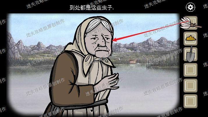 22.我们继续深入森林,进入屋子里,我们拿走在屋子右边的铲子,拿到后进入锈湖中心,把苍蝇拍交给老奶奶,把老奶奶的脸上的蚊子拿走。