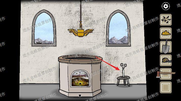 23.点击老奶奶右边的木桩把蜗牛和斧头拿走,进入白色建筑把右边凳子上的剪刀拿走,回到小屋里。