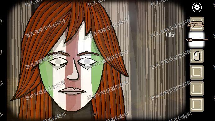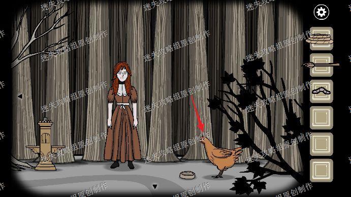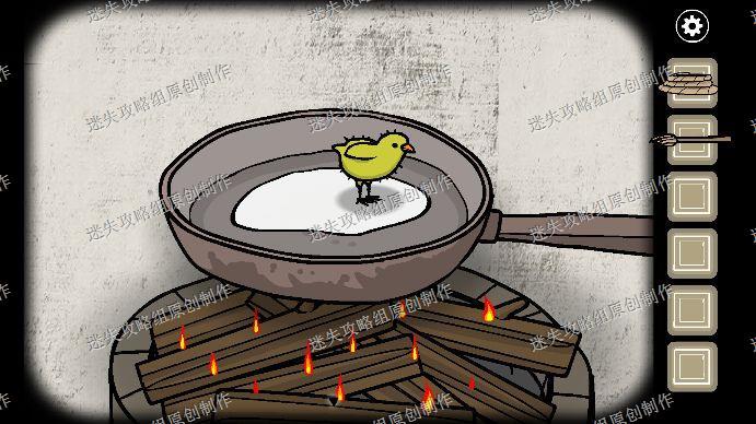 102.点击妹妹的脸,我们用刷子给她的脸刷上颜色,完成之后把她右手上的蜡烛拿走,深入森林进入小屋,用蜡烛把木柴点燃,把鸡蛋放在锅里,小鸡就孵出来了,拿走。