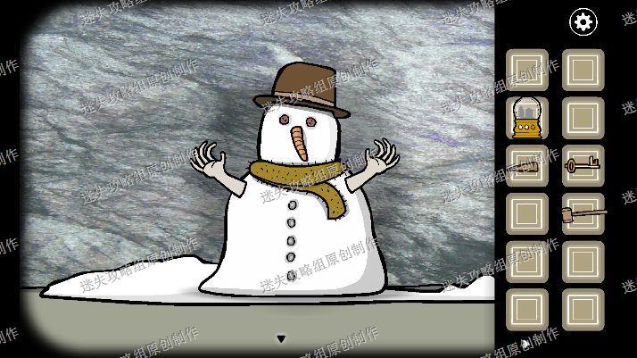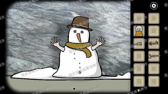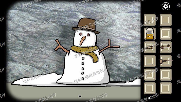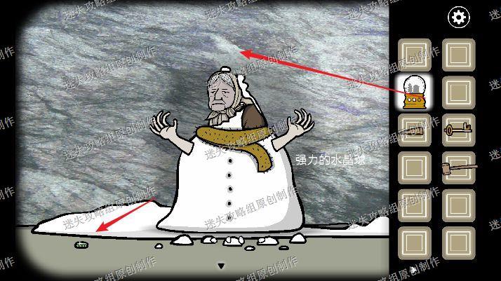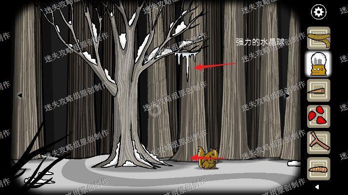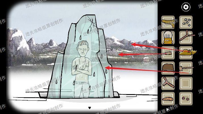 68.我们去到大门处,往左看到已经结冰了的弟弟,我们用尖木头和锤子把冰块砸开来,再把松鼠皮给弟弟穿上,拿走他脖子上的钥匙。