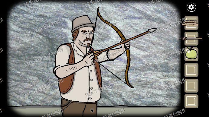 99.来到一楼,把尖骨头放在木棍前端,组成弓箭,我们来到外面把箭给左边的人,点击三下弓箭,角度拉高,射下弟弟的帽子。