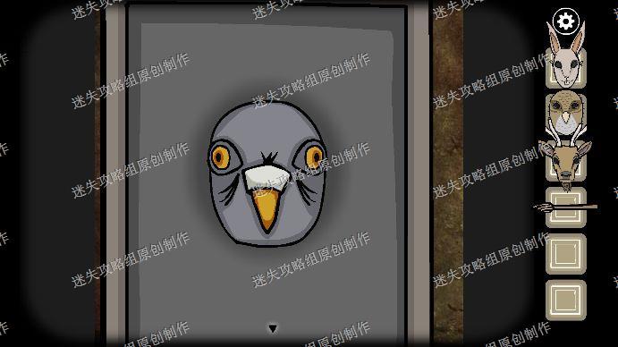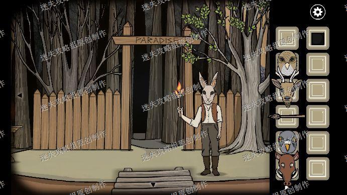 110.完成后出去,看到下方会闪闪发光,点击闪光的部分进入天堂岛,我们给每个人戴上面具,第一个为兔子,第二个野鸡,第三个鸽子,第四个野猪,第五个鹿头,我们来到了锈湖中心。