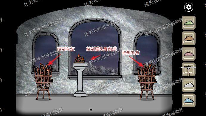 95.到了第三层之后我们从窗户看到外面有一只猫头鹰,三个火堆,中间控制猫头鹰前进,两边的火堆控制猫头鹰左右移动。