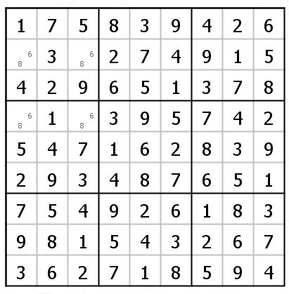 这种结构没法直接推出来数字和删除数字,但如果能在某行、列、宫找到和它对应的数对(数组),就可以删除那一行、列、宫的其他数字了。