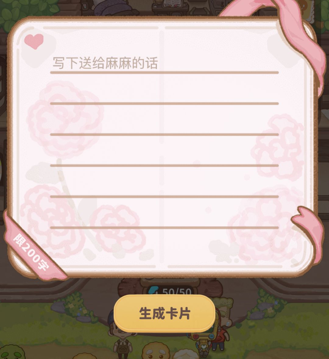新增“书写卡片向妈妈告白”活动限时3天(5.9日0时开启),通过主界面鲜花图标进入活动页面,输入你想对妈妈说得话,生成卡片后通过分享祝福即可让妈妈看到!(活动结束后随机选出走心内容在官方微博@乌冬的旅店进行匿名展示)