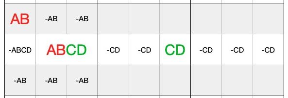 B1和R2深色背景4个待解格中存在且仅存在(A、B、C、D)4 个候选数,可将这4个候选数分成红(AB)、绿(CD)两个子集(红绿没有交集),将 4 个待解格按其所在单元分为宫、行两个子集,红色(AB)存在于宫的三格中,绿色(CD)存在于行的三格中,两个待解格子集存在交集 ABCD(交叠区域两格),交集中的候选数为红、绿两个候选数分离子集的并集,若满足这些条件,红、绿两个子集可各自对所在单元其他格内的候选数进行摈除。