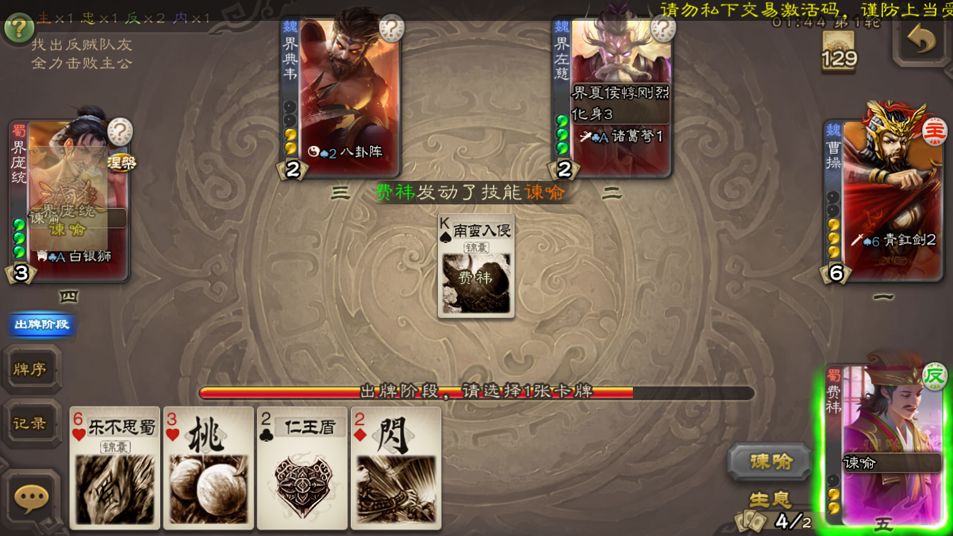 5、aoe循环使用组:如果队友是界曹操或者界祝融这种,费祎的一个南可以循环使用的同时还可以刷两次牌,美哉。
