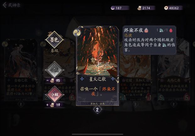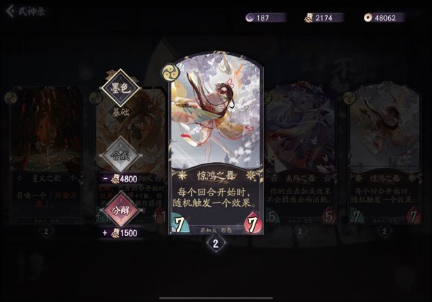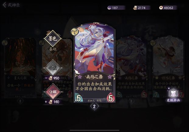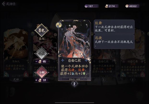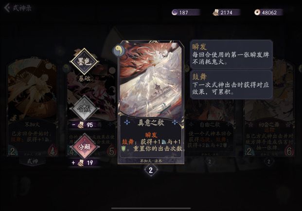 解析: 这张牌相当于给了每个式神一张战斗牌,并且瞬发鼓舞也能直接拿来+1攻解场或者+1血不死,配和不知火觉醒就是瞬发+2+2强度和桃花那张一样。是我认为不知火任何卡组都应满编的卡。