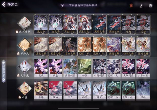 随机效果: 虽然效果是随机,但是基本都是有益的,如加血,群体伤害,单体伤害,加身材等,队伍能力越综合,触发的不可控收益就会越高,所以配和综合能力多的式神→鸦天狗,面灵气,海坊主等。