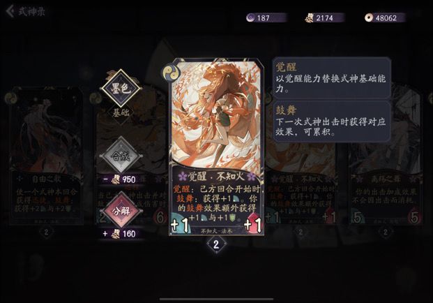 解析: 强度极高,不知火本身每回合+1鼓舞,配和觉醒就是每回合+2+1,相当于每回合一个二勾战斗牌数值的加成。场面交换给的压力非常大,有觉醒和没觉醒的不知火强度完全是两个式神。