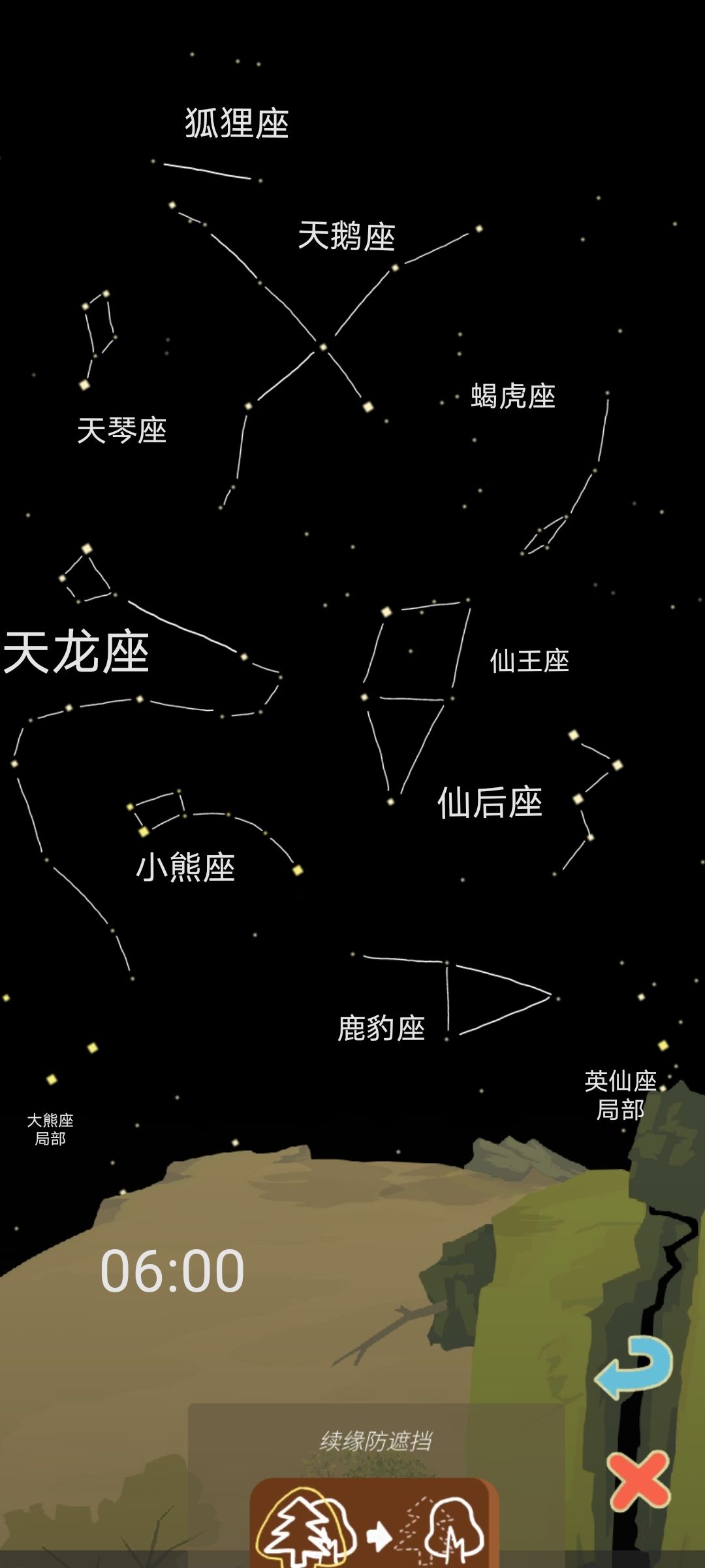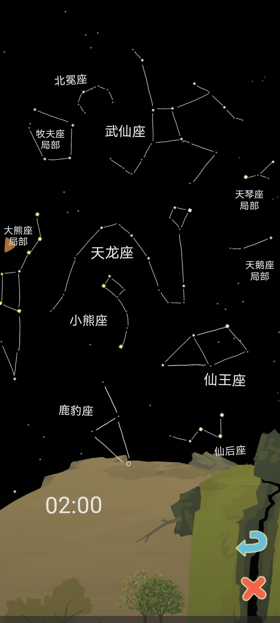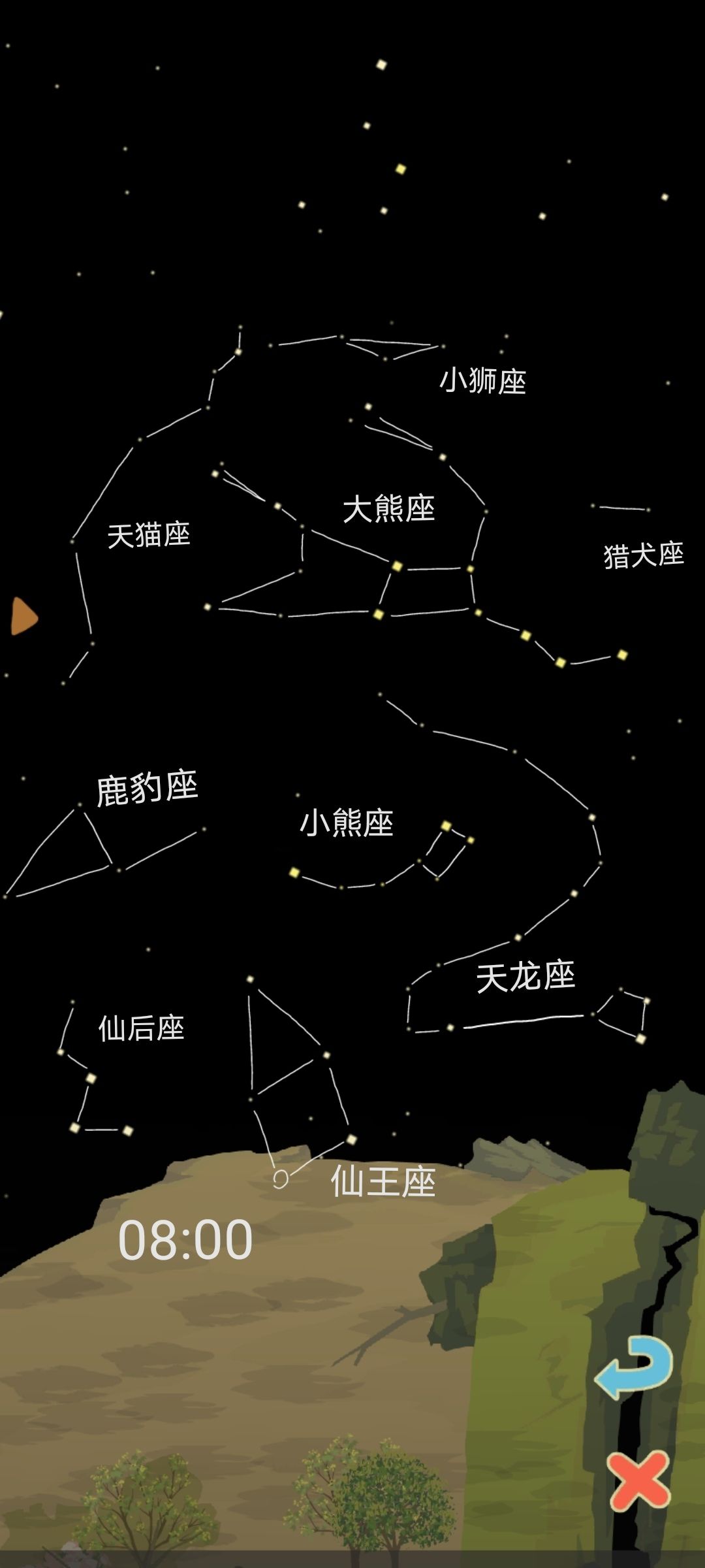 目前夏季能收集到的星座有:大熊座、小熊座、天龙座、仙后座、仙王座、鹿豹座、天猫座、小狮座、后发座、武仙座、猎犬座、北冕座、牧夫座、天琴座、天鹅座、狐狸座、蝎虎座共计17个星座(英仙座、牧夫座以及仙女座不可收集,如果想收集的友友,可以把时间调到12月),以下为晚间8点到早晨6点每隔1小时的天空变化: