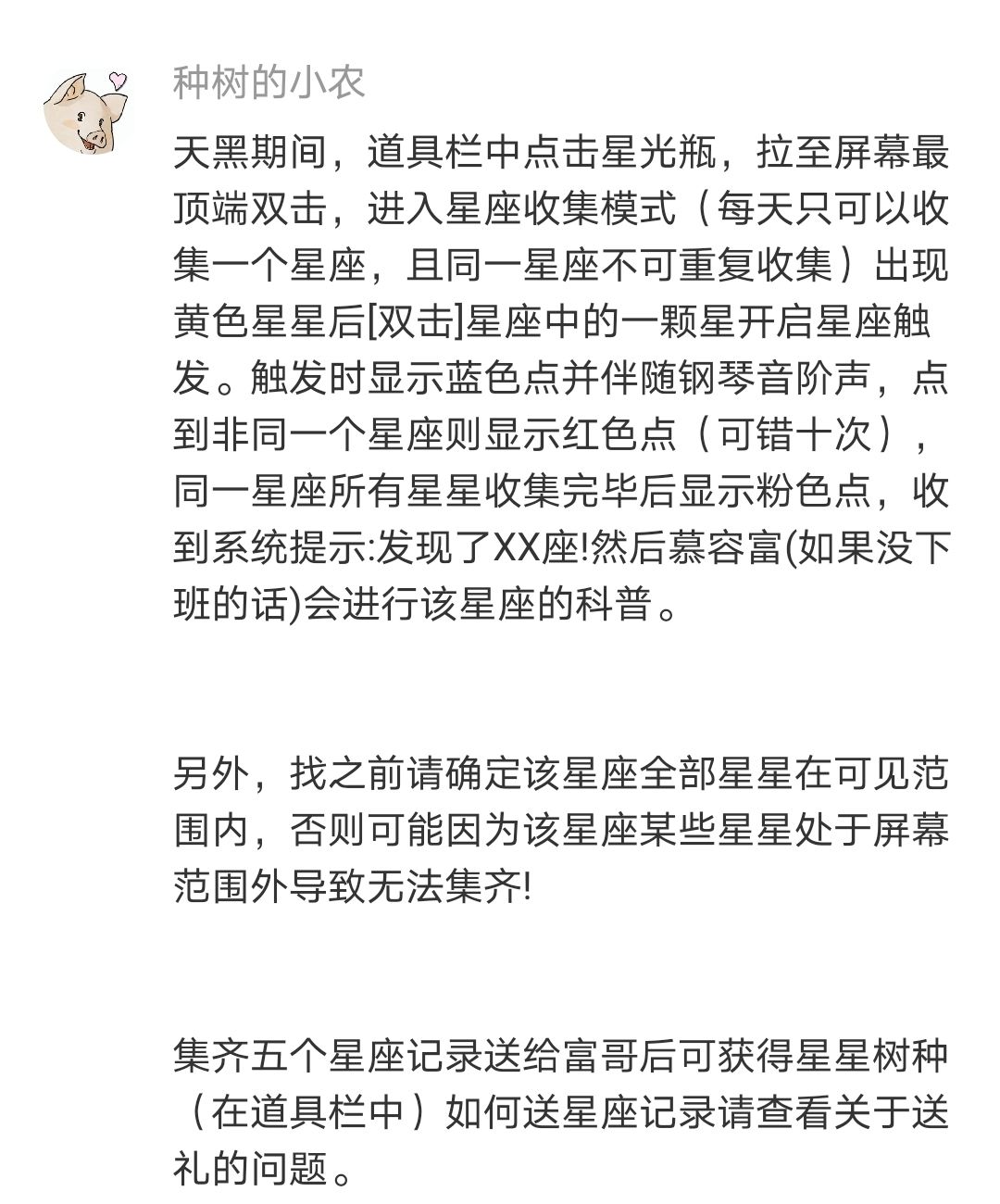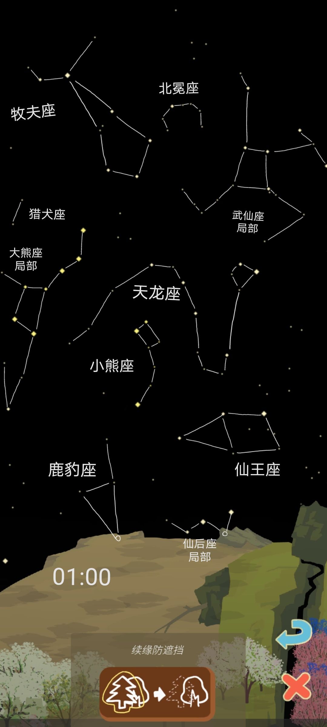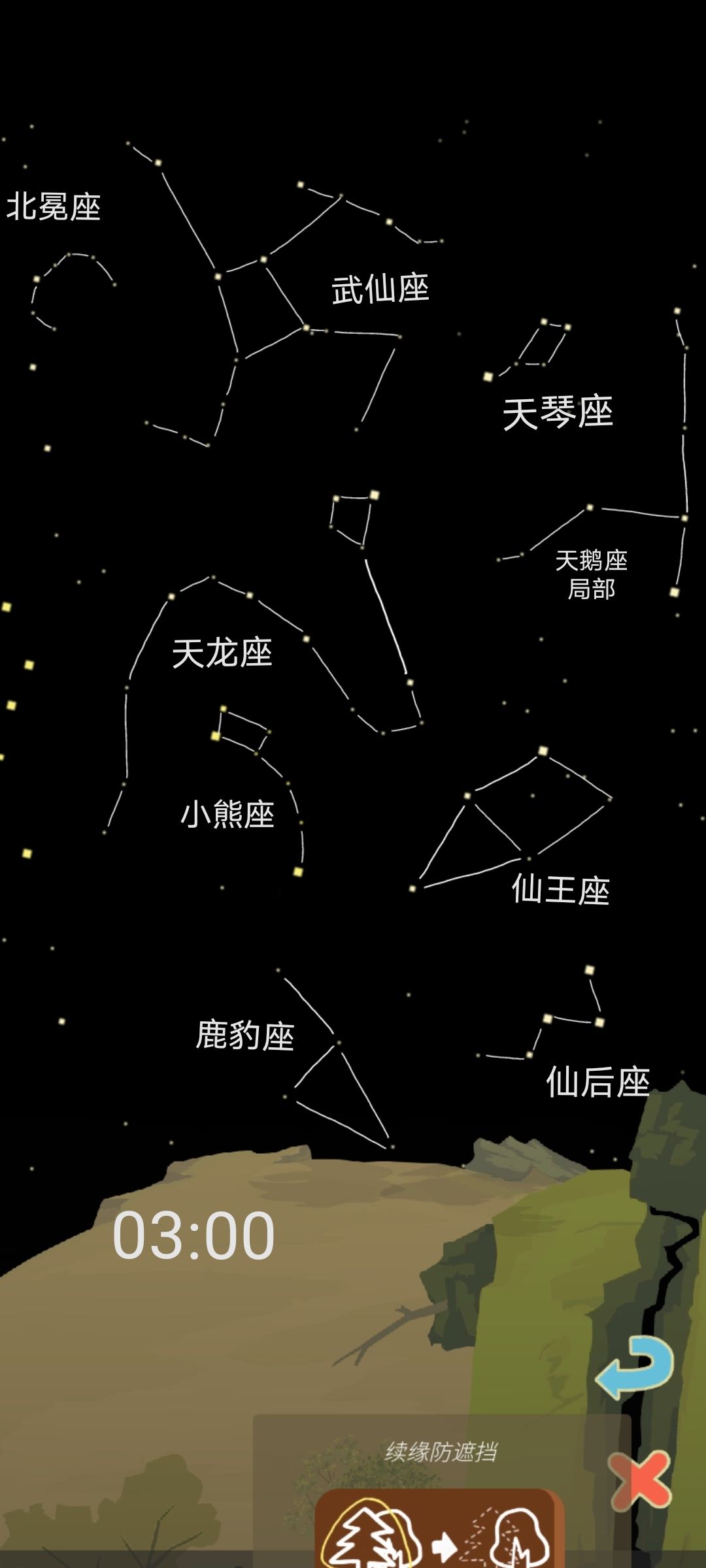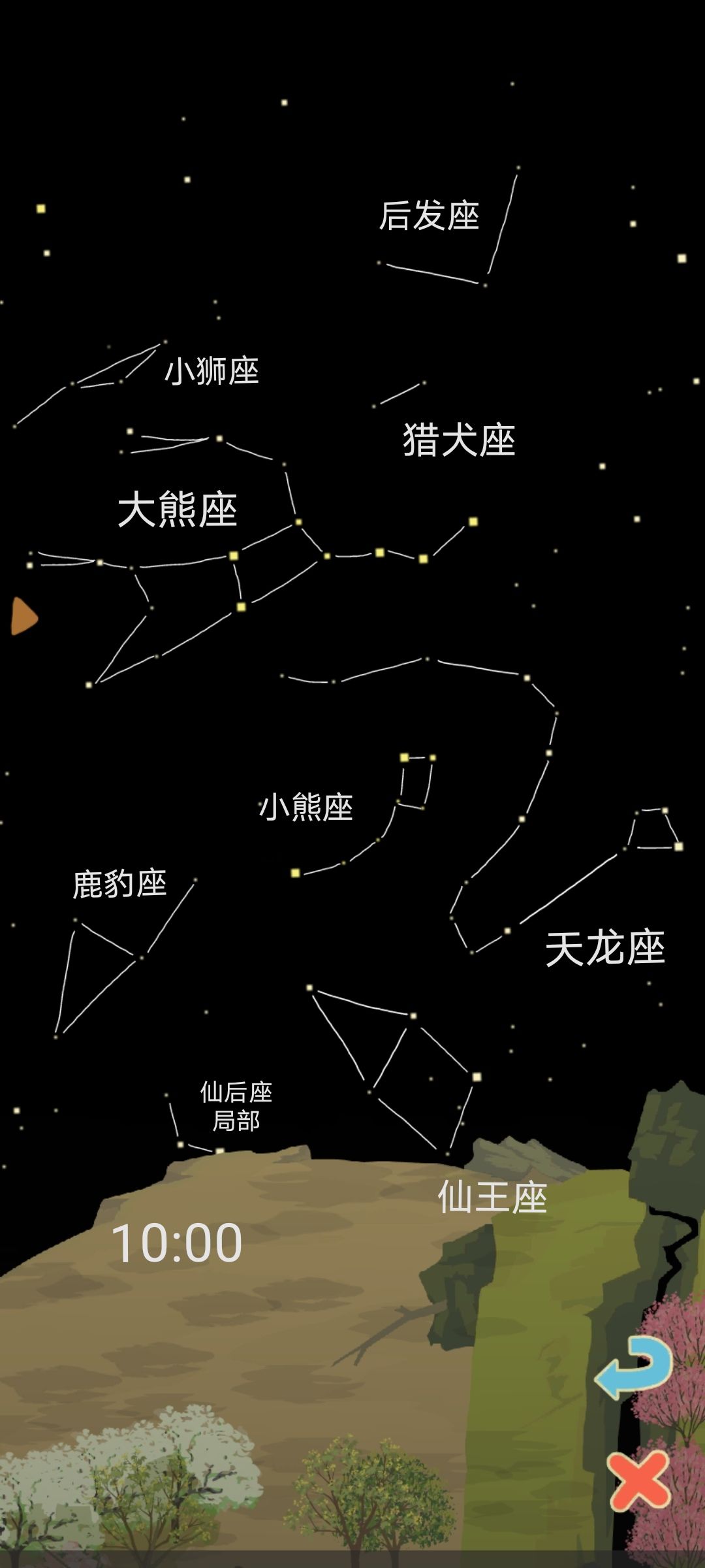 目前夏季能收集到的星座有:大熊座、小熊座、天龙座、仙后座、仙王座、鹿豹座、天猫座、小狮座、后发座、武仙座、猎犬座、北冕座、牧夫座、天琴座、天鹅座、狐狸座、蝎虎座共计17个星座(英仙座、牧夫座以及仙女座不可收集,如果想收集的友友,可以把时间调到12月),以下为晚间8点到早晨6点每隔1小时的天空变化: