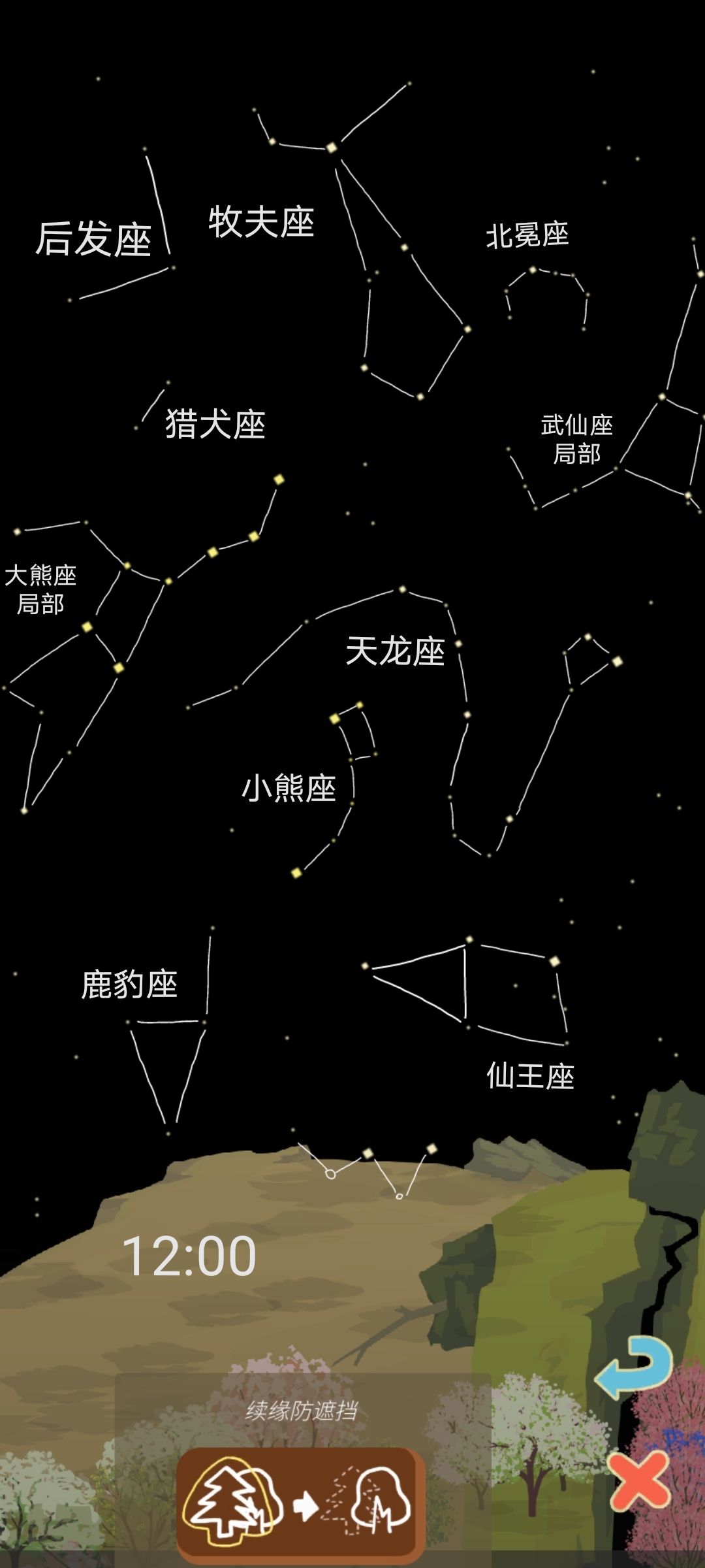 晚12:00能收集到的完整星座有:小熊座、鹿豹座、仙王座、天龙座、猎犬座、后发座、牧夫座和北冕座共计8个星座。