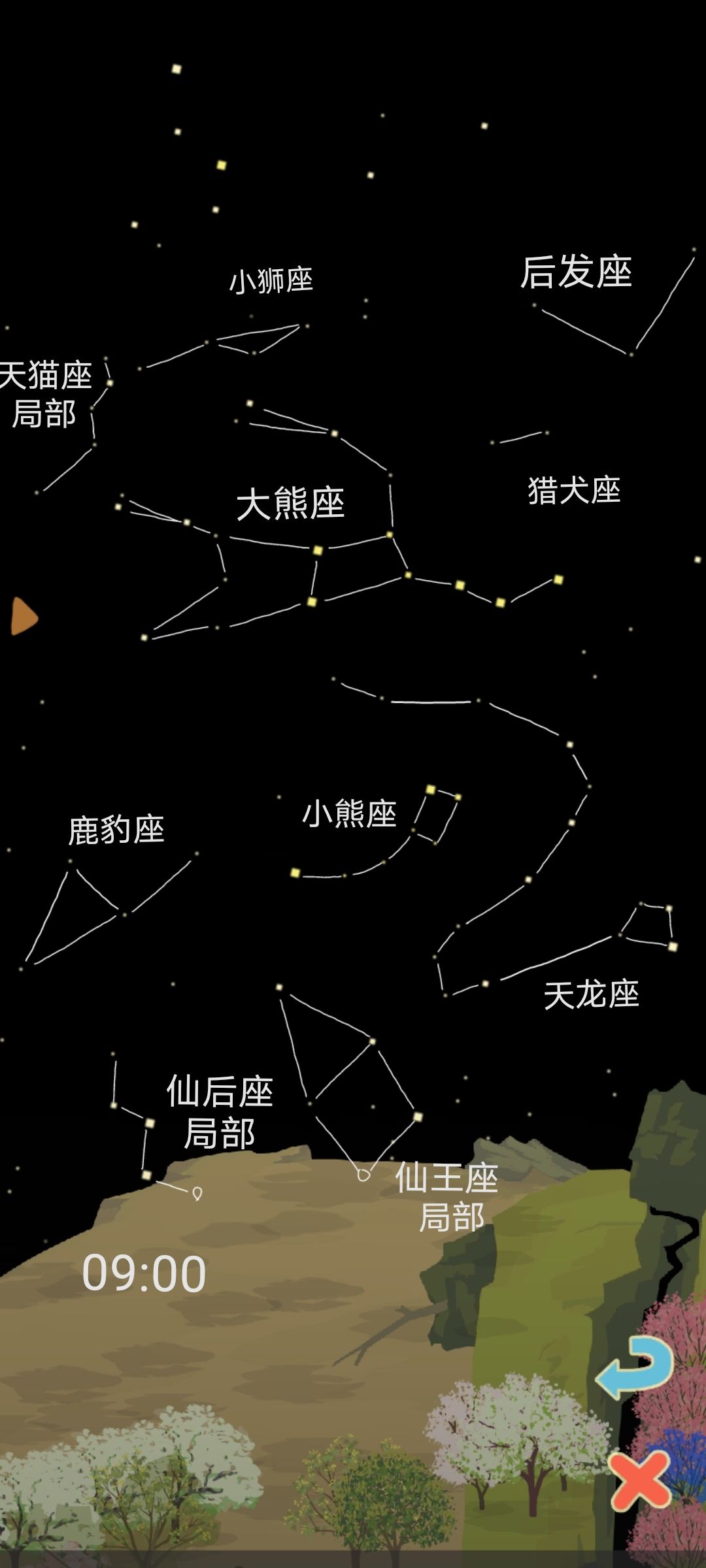 晚9:00能收集到的完整星座有:小熊座、大熊座、后发座、鹿豹座、天龙座、猎犬座和小狮座共计6个星座。(仙王、仙女差的一颗星隔着山也能点)
