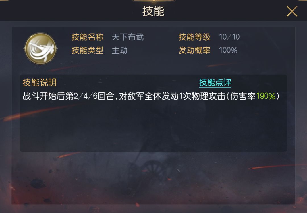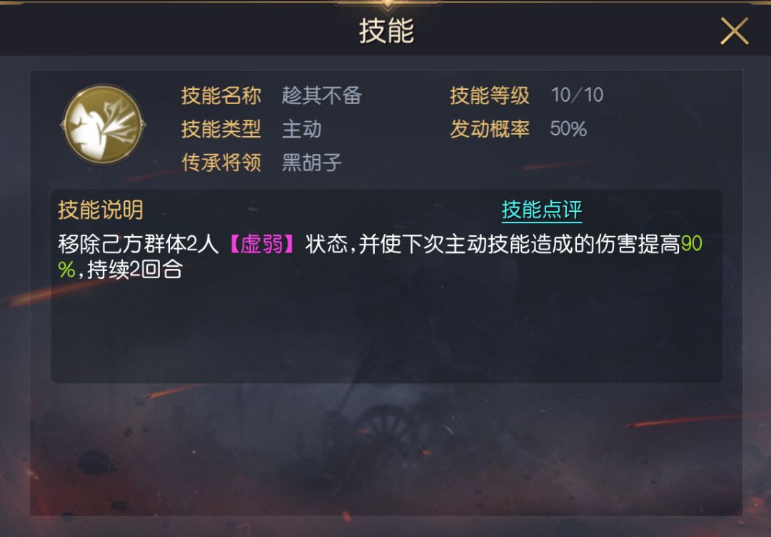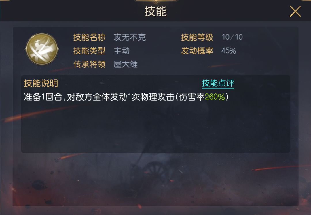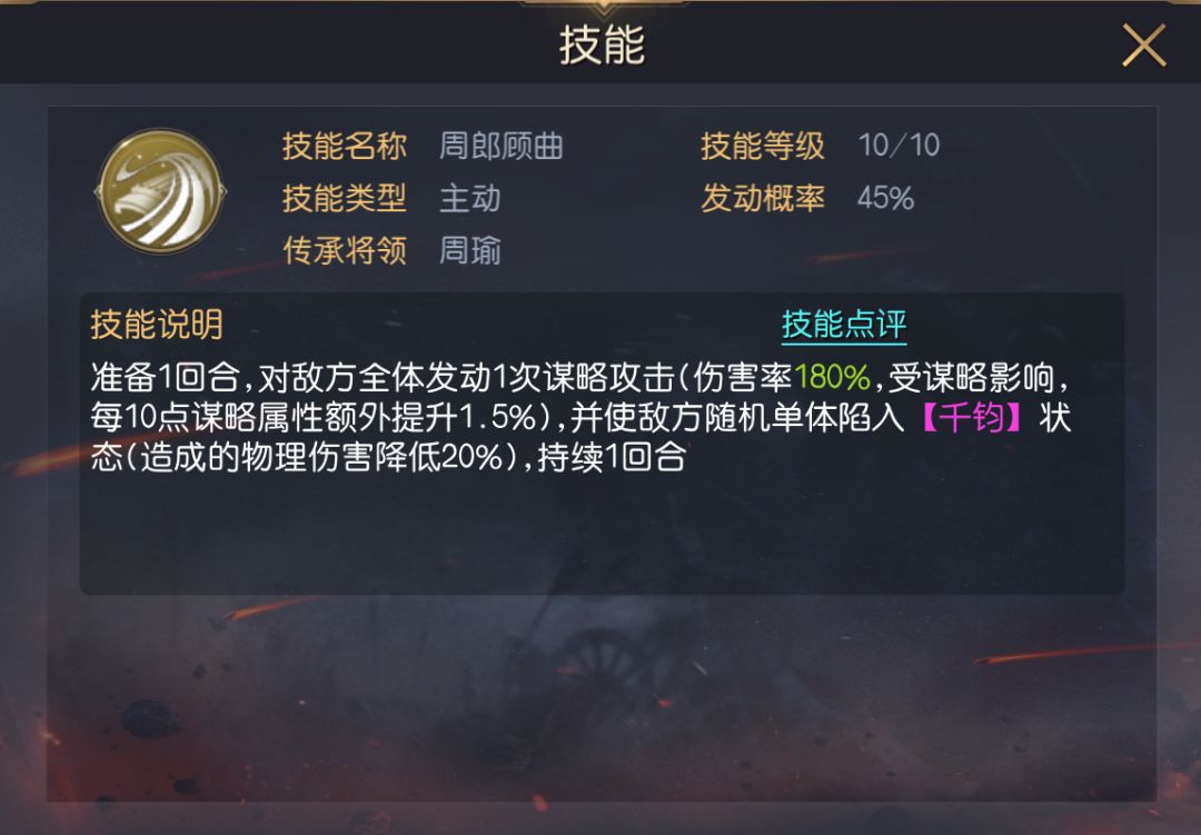 二技能推荐攻无不克,伤害率较高的全体技能之一,发动效率与周郎顾曲一致,也是队伍中的核心输出技能。