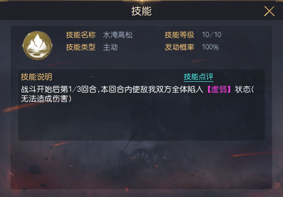 三技能推荐周郎顾曲,该技能需要准备回合,对虚弱期有较高的容错率,加上联姻与乘其不备的效果,几乎不会在陷入虚弱时发动。