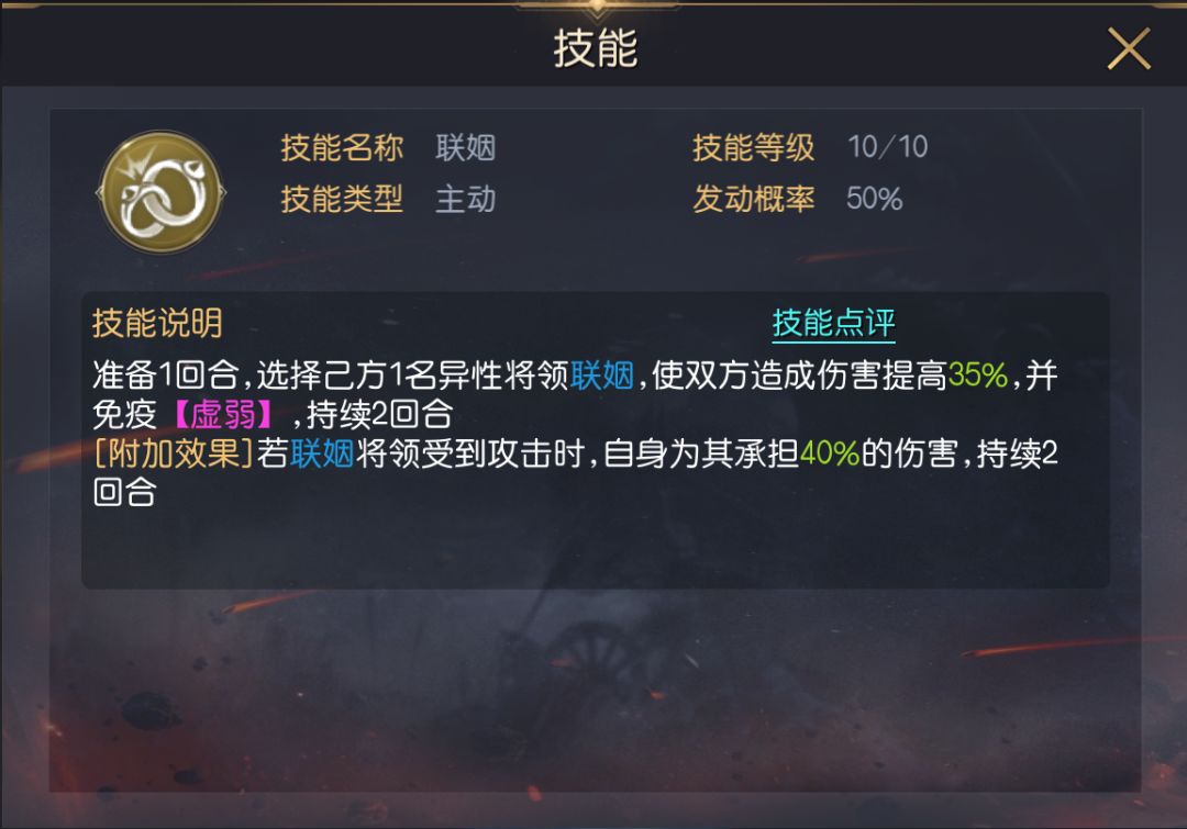 在队伍基本成型之后,除了将领自带技能仍然要考虑配置技能,而特定回合发动的技能较少,所以输出位携带的常规技能仍有可能被虚弱影响,这就需要另一名将领来避免该缺点,凯瑟琳二世自带技能联姻能让目标与自身免疫虚弱,并提供伤害加成,持续时间长达2回合,有极高的效率规避掉虚弱期。