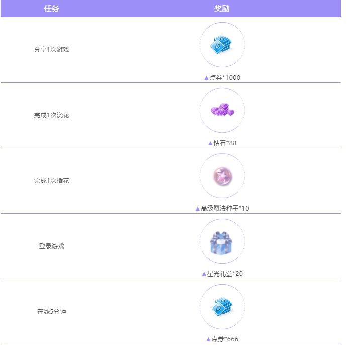 截止至5月10日,完成指定任务即可获得钻石*88&高级魔法种子*10&星光礼盒*20&点券*1666的假期乐享福利~