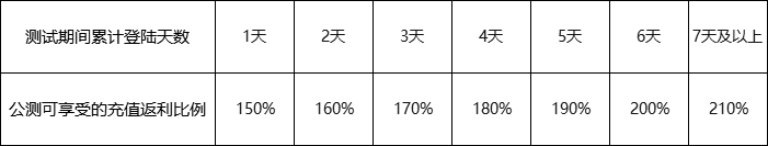 1、返还比例:测试期间玩家所有充值包含钻石充值、直购礼包、特权基金等将会在游戏公测中以充值卡的形式进行返还,充值返还比例根据玩家在测试期间的连续登录时间有所不同: