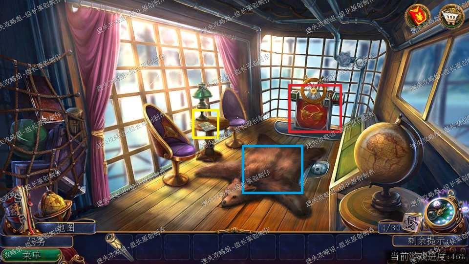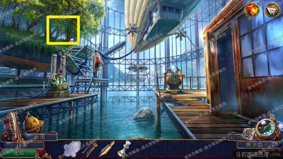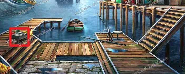71、桨架对下图黄框处使用,点击船桨,小船修复,前往齐柏林飞艇库,对话后进入工作室再对话完成剧情。71