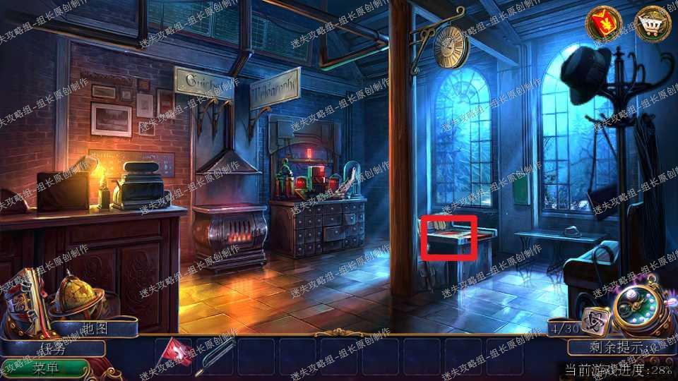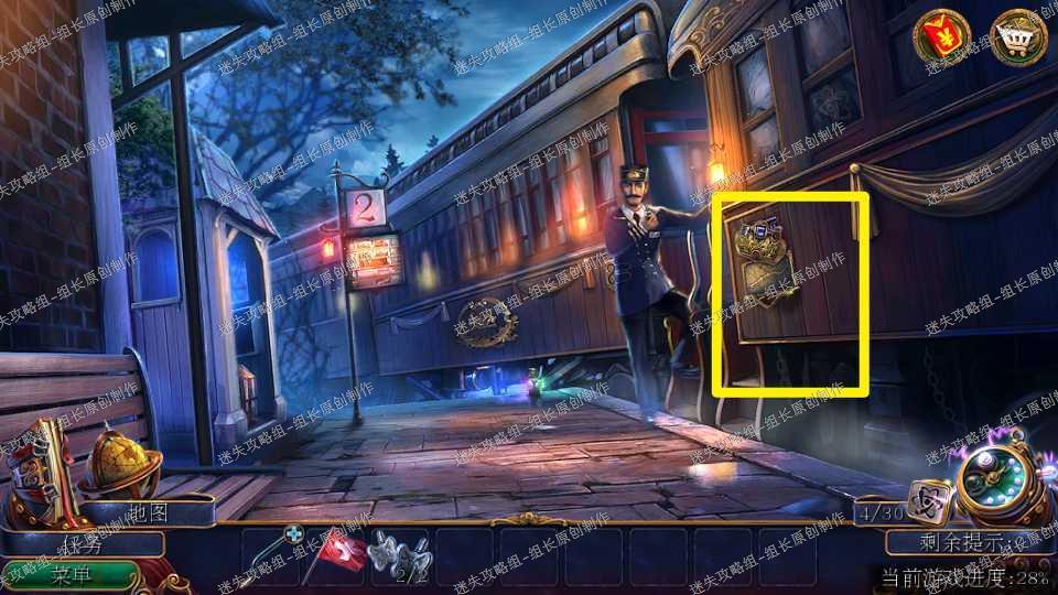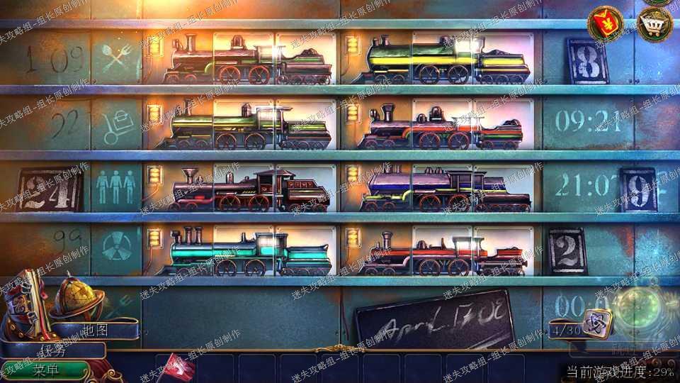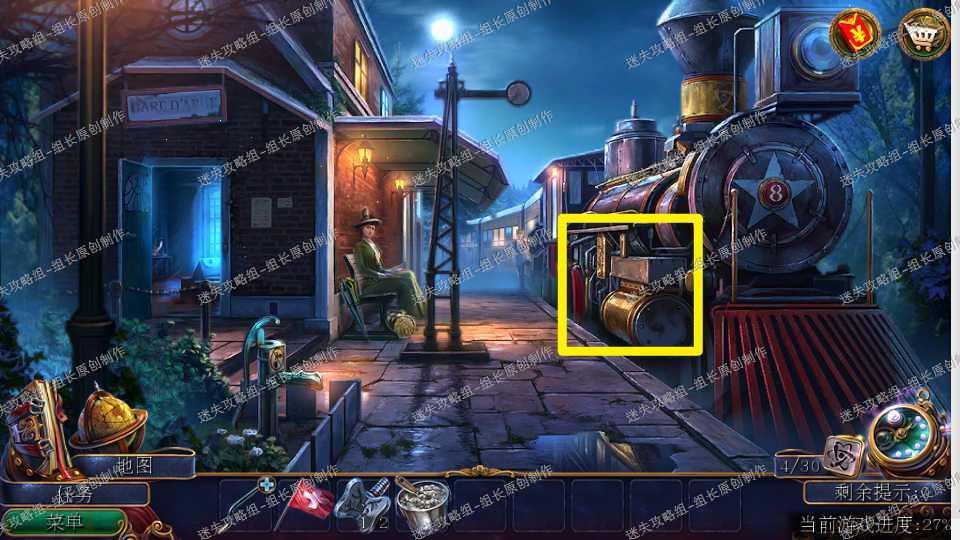 53、前往下图位置,装好导线修理包,前往候车室。中间的桌子点击放大桌子后,中间的设备边上的摇杆点击一下,通上电,出去跟车长和绿衣女士完成剧情,回到候车室。左边的桌子点击进入小游戏。53、1