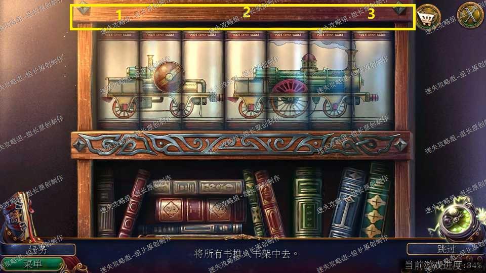 64、黄框处的桌子点击放大后看到报纸信息。红框处点击放大后得到鱼饵和猫头鹰雕像。白框点击放大后得到拨火棍。将猫头鹰雕像放到黄框处的桌子底座上,得到书、钻石别针,同时看到线索。出去跟店主对话,得到书,回到房间里的红框处,放上两本书进入小游戏。64