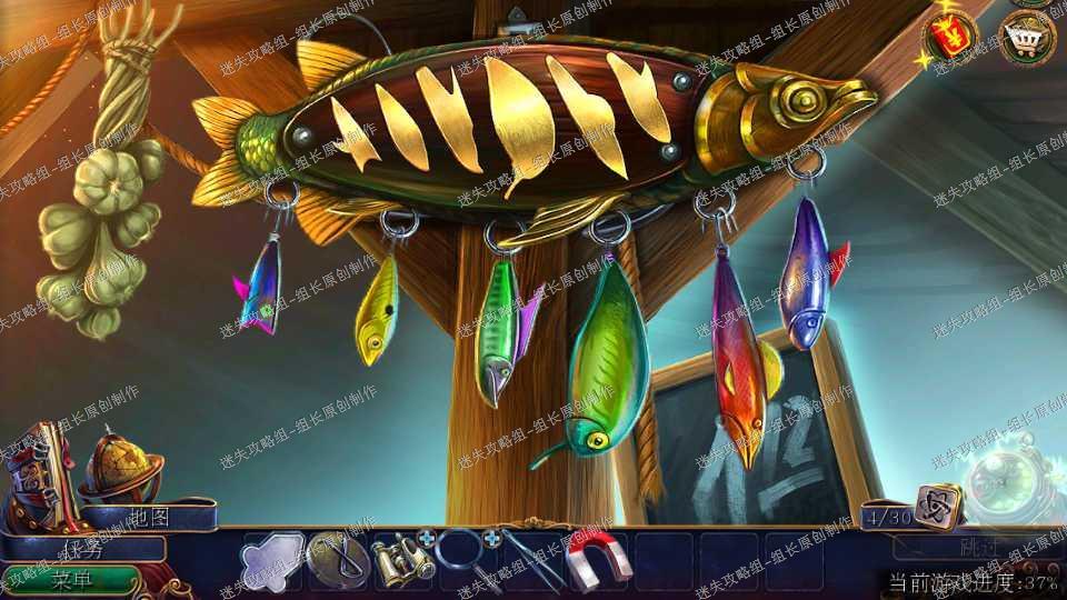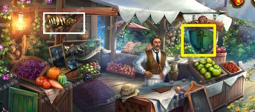 67、前往店主处,黄框用锚打开得到鱼头。再去码头,红框处放上鱼头,使用钻石别针打开。下面是一个小游戏,就是各个格子点击后可以移动,多次重复就能拿到各层的物品包括:镜框、镊子、鱼饵、吸铁石。再去店长处对左边白框处的鱼使用鱼饵,得到开罐器,开罐器直接对望远镜使用,得到镜片,镜片再与放大镜框架组合得到放大镜。67、1、2
