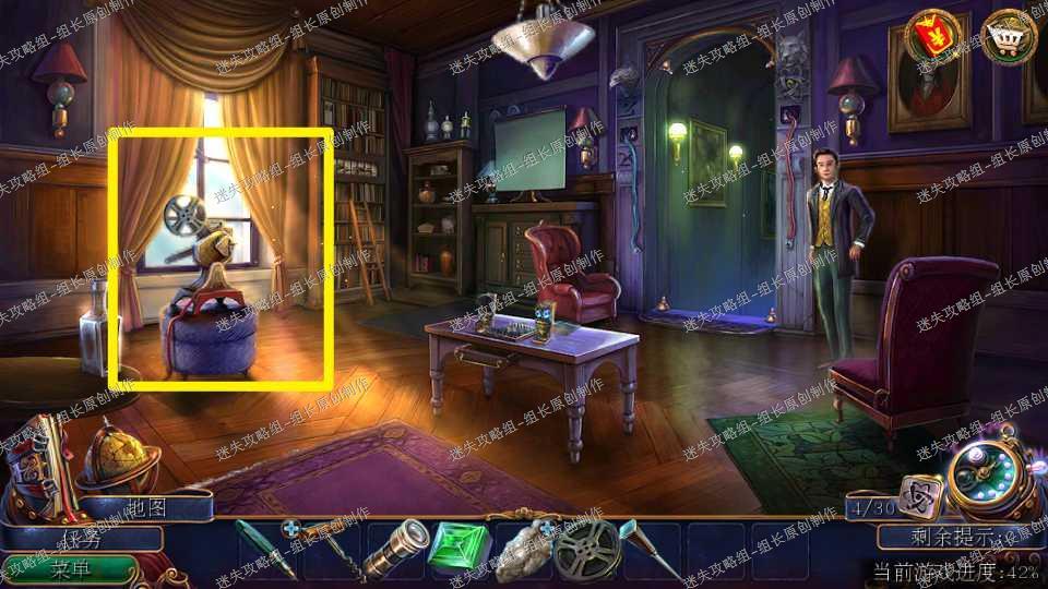 79、黄框处的设备使用放映机镜头和胶卷,合上窗帘,之后点击放映机进行放映,完成剧情。