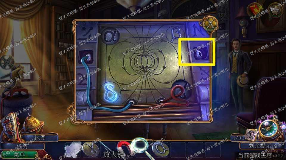 68、去到父亲房子,触发对话剧情,得到阿尔法徽章。对房子壁炉上面点击放大,发现下图黄框处无法连接,使用放大镜,然后用镊子把里面的东西夹出来,之后链接电线,之后放上两个符号,中间使用磁铁后点击旋转,进入剧情。68