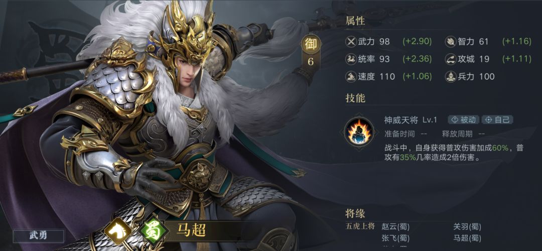 马超是蜀国的顶级武力输出,同时是普攻流的输出武将代表。