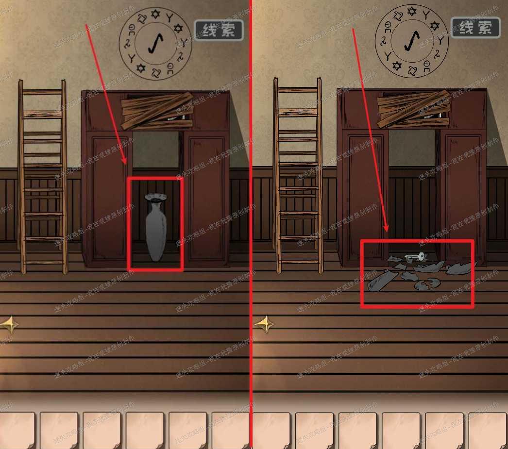3、向右回到之前打碎花瓶的那个房间,点击柜子上的木板放大场景,接着点击木板将其打碎,拿走格子里的两件物品,最后再拿走柜子旁边的梯子。下一段开始各位会发现我的物品栏里没有梯子,这是因为我忘了拿,总之各位先拿上,用到的时候我自会讲解。3X1