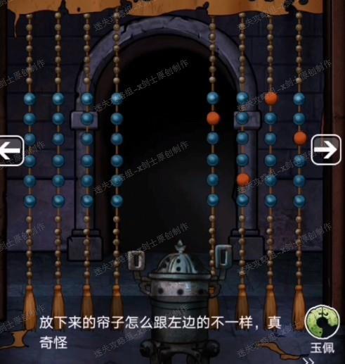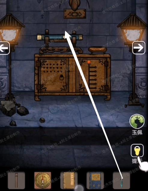 4、接下来向右两个场景,来到卷帘这里,点击右边绑着的卷帘,进行小游戏完成之后得到绳子。得到密码提示。85.1