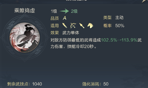 武技选择方面,为了最大化输出能力,孙策可以搭配上对敌方智力最高武将造成伤害的“强勇胜机”,对敌方防御最低武将造成102.5%武力伤害的“乘隙捣虚”。