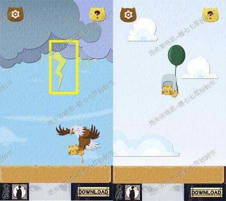 14、 点击三次云彩让他变成闪电,然后把移动老鹰躲避闪电,观察哪个闪电会变大,就是下一个闪电闪出的地方。移动几次之后开始下雨,进入到下一个场景。然后会有气球和塑料袋经过。快速收集,收集到之后让老鹰撞到下一个物品,让猫咪掉落。然后赶紧把气球和塑料袋给猫咪,让猫咪平安降落。14/141