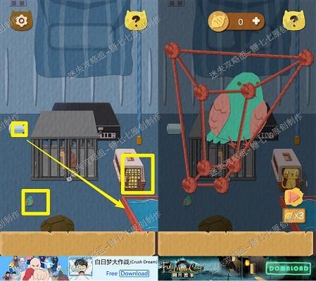 19、 打开猫笼子把猫咪放出来,按照从上到下的顺序依次点击三遍,然后把鸟儿的束缚解开,数条线之间没有交叉就可以。如图所示,然后捡起地上的玻璃瓶,然后在右边的水池里面灌满水。19/191