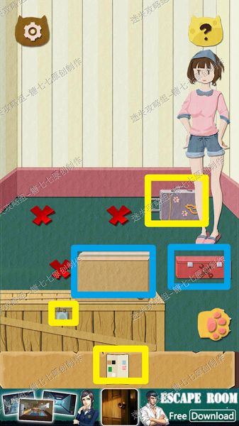 首先开局点击箱子,拿起箱子里面的石块划破箱子,让猫咪跑出来。游戏就正式开始了