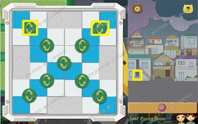 ❺最后再转动最上面的两个按钮把蓝色方块转回对角,如图所示,货车开走,拿走窗户前面的圆。76、77