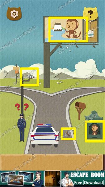 24、 捡起地上的手臂,装到右边的猴子上面,然后把猴子的造型摆成广告牌上面的样子,拿到钥匙,用钥匙打开摄像头上面的锁子,拿到SD卡,然后把SD卡装到警车上面,查看到车子离开的路线。24