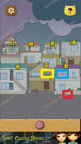 8、 把中间房子的花盘按照房顶的颜色——红橙黄绿青蓝紫摆好,拿到窗户边一个半圆,右下角地上拿到一个晴天娃娃,右边的房子窗户里面拿到一个方形。8