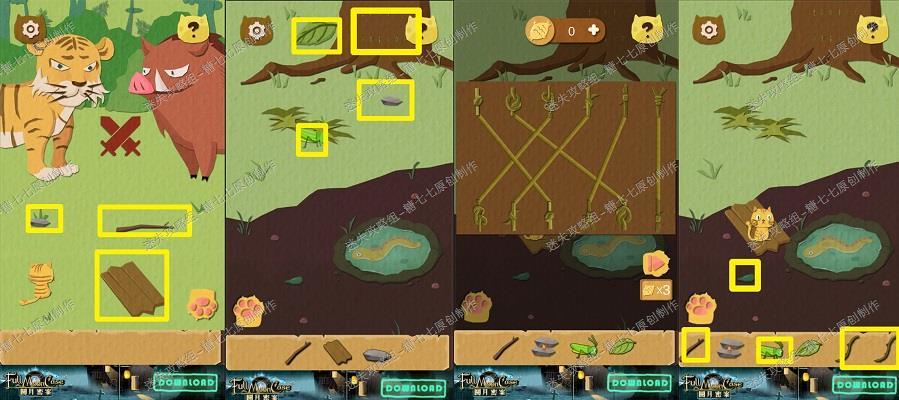 16、 收集上地上的石头、木板和树枝。然后移动到下面的画面,收集草堆上面的蝗虫,树旁的树叶和打火石。完成大树上面的配对游戏,上下找到对应的连接到一起,得到两根树藤。然后把木板铺到沼泽地上面,让猫咪上去,拿到左边地里面的绿色气球。然后把棍子、树藤和蝗虫都给猫咪,然后钓到电鳗,然后把气球放到水池灌满水里面得到一个水球,然后再用树叶包上沼泽泥。16/161/162/163