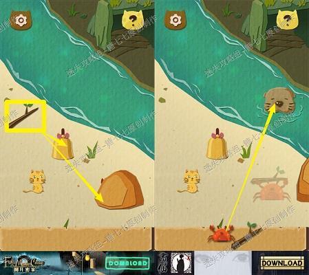2、 捡起树枝,用树枝敲击铃铛,吸引海豹出来。然后用树枝翘起石头,然后把树枝给螃蟹。拿起螃蟹给海豹,然后点击海豹,让海豹抱着猫咪过河睡觉。2/21