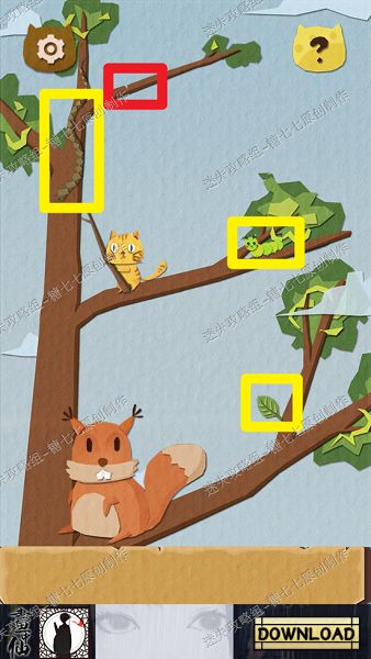 6、 点击最下面树杈上右边的叶子,点击中间树枝上的虫子。赶走上面的蛇。拿到一个黑绳子,把黑绳子绑到最上面树枝裂缝的地方,然后让猫上去。6