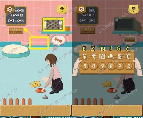 21、 右边的小箱子完成谜题,把猫头跟狗头交换位置,然后拿到骨头,交给女人。把骨头丢出去让猫捡回来,然后再让女人丢出来一个小圆,然后我们捡起后面墙上的数字小圆,然后根据小黑板上的内容推算出CE交叉在一起的标志为—5,长得像个之的标志为—8,长得像个N的标志为9,长得像俩J的标志为—6,长得像个G的标志为4,长得像个C的标志为—2 ,如图所示,具体推算过程如下,摆的正确时候开始拨打电话,电话号码为刚刚摆好的数字。21/211