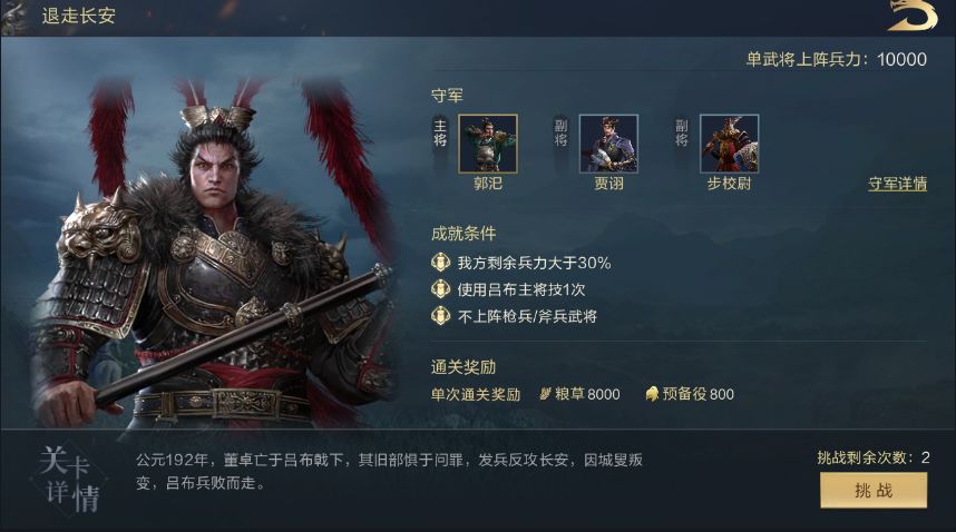 主公的技能能够为吕布提供很高的武力加成。敌方主将郭汜是个躲在后排的弓兵,没有办法直接集火,不过本关也没有关于敌军总兵力的要求,己方限制也十分宽裕,因此1V1让吕布找郭汜单挑就行。