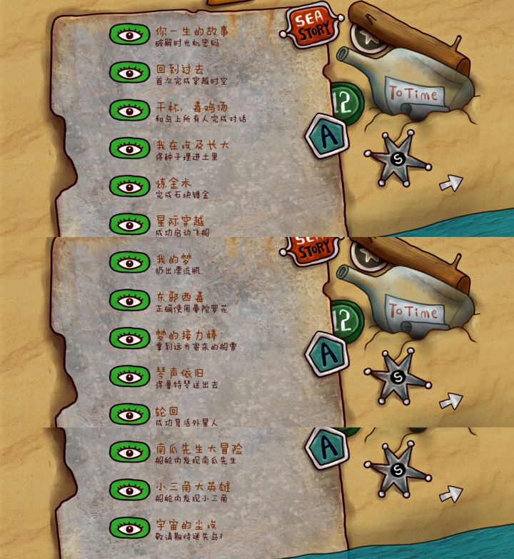 安好沙漏,开始。屋内一张素描记一下,旁边,桌上捡到火柴和蓝莓,对话老奶奶得知老爷爷会寄来船票,开启时间密码在本子上。修好壁炉旁的电线上楼,翻看老爷爷记录本拿到信箱钥匙,打开红信箱拿到船票。往左走到码头,给检票员船票,对话灯塔管理员得知灯塔指示灯没通电,灯塔密码是北南西东东北。出来继续往左路过挂着一张图纸的栅栏并捡到空瓶子,到工厂连线开门,工厂里梯子上捡到灯泡机器上捡到空间石块,屏幕上在播放奇怪符号,进去对话解刨员得知旁边坏掉的机器多硬的东西都能砸开,连线打开危险左大门见到外星人,墙上画着火箭的密码,根据栅栏上的图纸09打开右大门见到五个符号木桩,比照爷爷实验室黑板图案左右、左右、中左、中右打开铁盒子拿到鲁特琴。出来继续往左路过能看到火箭的小路前往灯塔,NSWEEN打开灯塔大门,一楼捡到铲子和拼图块,二楼捡到鱼饵和锯刀并把空瓶子给瞭望台的小孩,三楼捡到异形钥匙并修好灯塔,异形钥匙打开一楼电箱拉下闸后去到二楼拿到排风口的摇柄。去码头,船回来了,码头旁有小孩的漂流瓶,记下图案,上船,在甲板对话旅人得知他想要蓝色羽毛,按下喇叭所有按钮召唤一条飞鱼,在船舱捡到胶布,对话灯塔管理员得知一条大鱼在底层船舱和他的鱼饵可以诱惑楼上的鱼,对话小女孩得到一个时间3:42,上楼,鱼饵喂给鱼缸的鱼拿到底层船舱密码63942,开启底层船舱见到鲸鱼并捡到时间石块。去工厂给解刨员飞鱼,拿走他的刀并用胶布接好旁边机器的线修好机器。去码头调整检票员旁边的时钟到3:42打开阁楼,在桌子捡到蓝石块和铅笔,对小孩得知彩灯少一个,灯泡跟他换贝壳,八音盒安上摇杆得到乐谱DGEGDA,去船舱底部切开鲸鱼拿到矛头和鱼骨头。回奶奶家用锯刀锯下壁炉上的鹿角,实验室给机器安上两块石头,在记录本密码页用铅笔涂出笔痕得到密码,对照工厂屏幕点点和符号24、14、12、34、12、13、23、1234激活时光机回到过去。落点大手石雕,往右路过阿努比斯到火箭悬崖下对话小男孩得知在下面钟棵树能爬上去和蜥蜴想抓住海鸥。巨手往左是海鸥石雕和一条石阶,在往左在法老雕像前用铲子挖出一块异形块,在往左是眼睛石碑。把巨手前面的蜥蜴赶到海鸥石雕,驱赶石雕上海鸥让蜥蜴恐吓拿到白羽毛。上海鸥石雕旁的石阶来到神庙,用码头漂流瓶月亮上眼睛右太阳下星星左星球左开门。神庙一楼最里推砖开门对话大胡子得知曼陀罗花能让蜣螂安静后面门密码就是瓶子蜣螂花纹和他想要蓝色果实,给他蓝莓拿到一朵曼陀罗花。神庙二楼对话小女孩得知琵琶可以唤来蓝鸟,给她鲁特琴对话后弹奏八音盒乐曲DGEGDA唤来蓝鸟,对话后得知蓝鸟怕火火柴点燃身后火把吓走蓝鸟拿到蓝羽毛。给后面门安上蓝色石块开门,在陶罐里找到石饼,给雕像安上矛头拿到蓝珠子,前方拼图加上拼图块拼好拿到绿色药水。去眼睛石碑安上蓝眼珠,路后是宇航员石雕,石雕底座九宫格机关是奶奶家的素描,叉方叉圈长叉叉叉角激活宇航员得到线索。从巨手回到现实,去船舱上给虫子喂曼陀罗麻醉它拿到密码,顺便把蓝羽毛给甲板旅人拿到化石蛋。去工厂用机器压开化石蛋拿到种子,绿色药水喂给外星人,外星人跑了,身后的墙露出了符号和对应物品。回过去,打开神庙虫子门后对话大胡子得知秘密和雕像有关。找小男孩让他种下种子后回现实。火箭悬崖可以上去了,外星人房间密码打开火箭,一楼有个需要能量的机器,二楼安上箭头拿到花,拖动解锁休眠仓对话宇航员得知飞船没有燃油。到工厂09号房间根据旁边房间墙壁线索沙漏鱼骨、水流鹿角、锯齿贝壳、眼睛花、爬虫羽毛放好物品开启炼金阵给石饼镀金后回过去,神庙石头门里放上金石饼,根据石雕眼睛方向上左、左下、右右、上上调整机关拿到能量块。回现实火箭安上能量块后到三楼,用过去宇航员石雕给的方案右下、下、右上、左上、右、上调整仪表启动飞行器。