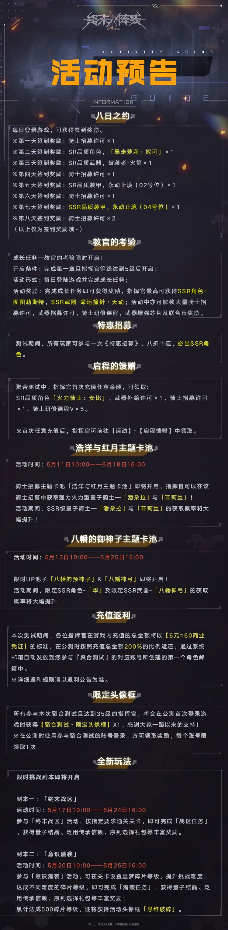 《终末阵线·伊诺贝塔》聚合测试将于5月11日10:00正式开启~快来天启号上指挥作战吧!小一为各位准备了以下开服活动,请指挥官们查收!