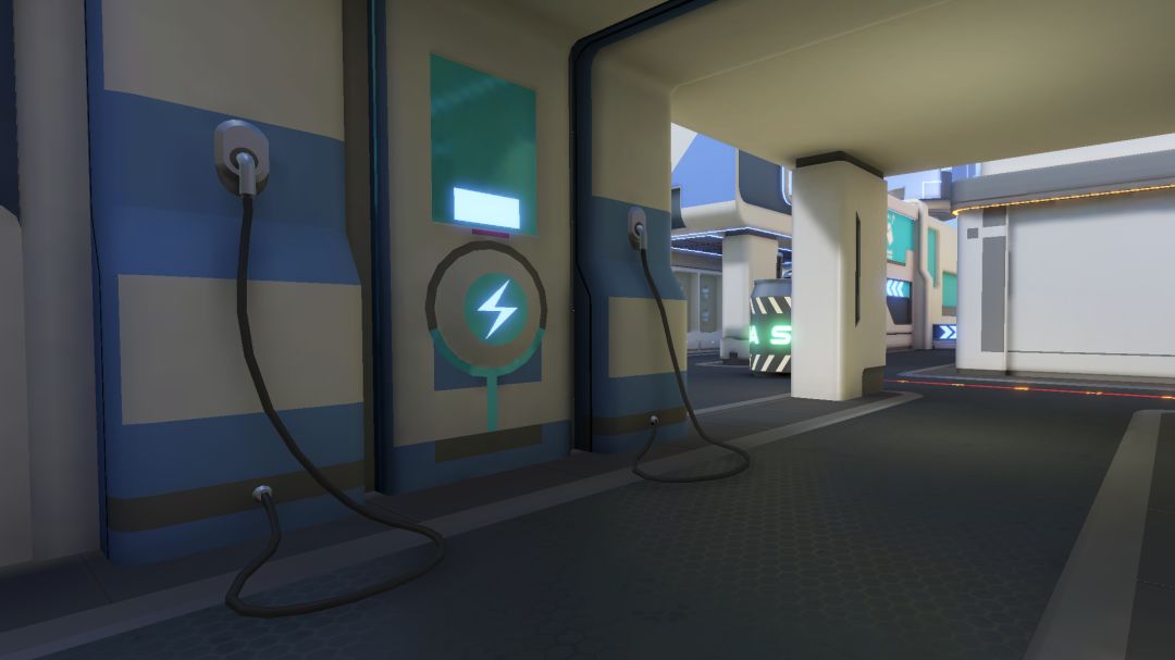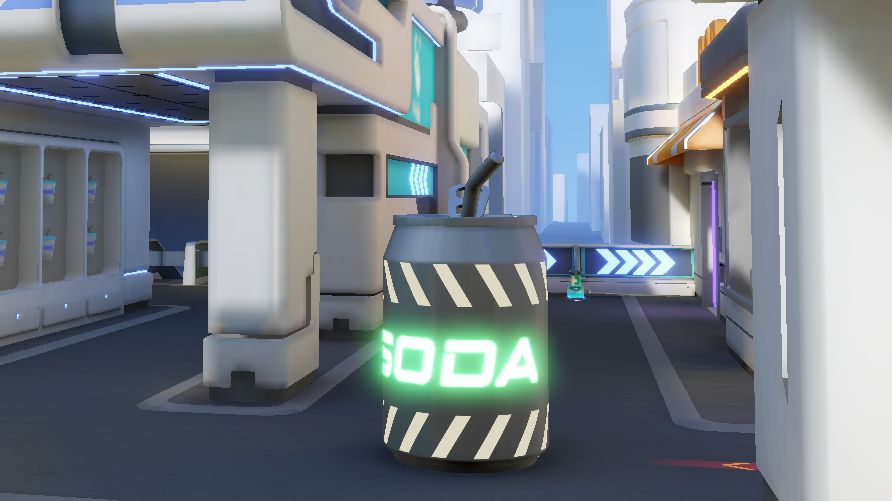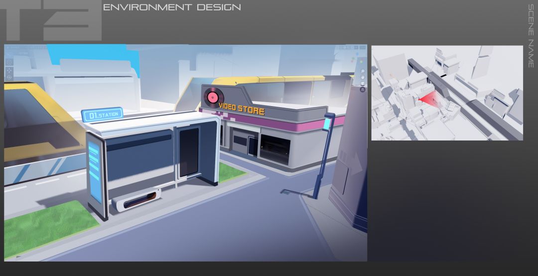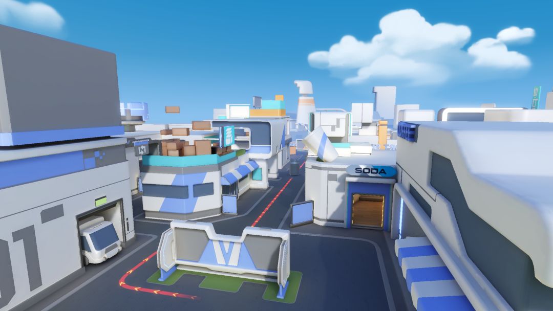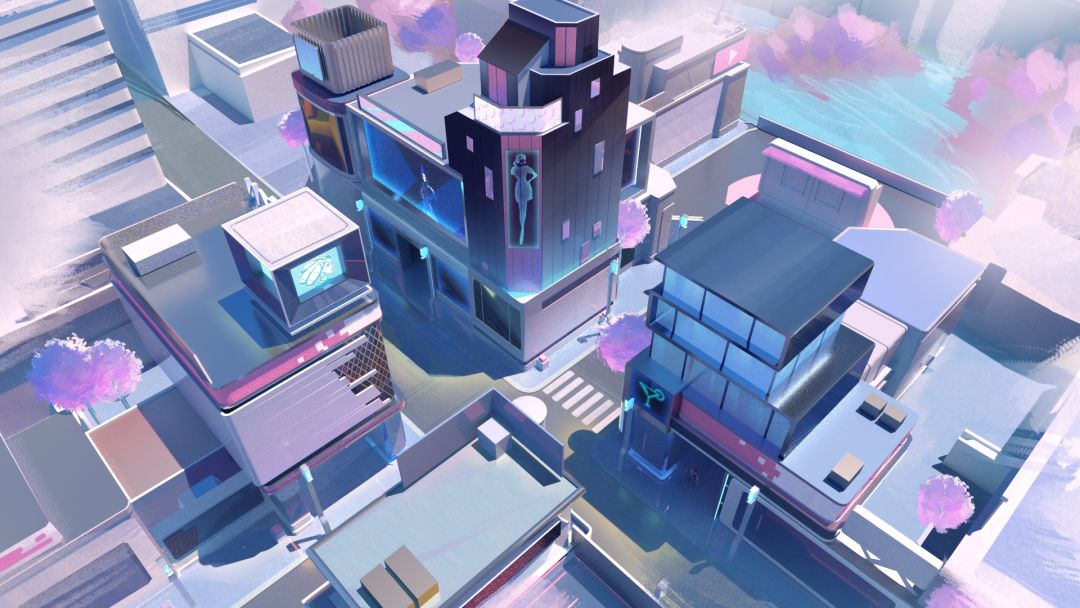 最终,我们决定把这个障碍物包装成一个汽水罐,为这个充满商业气息的街道增添一丝丝娱乐感~十字路口这张地图,是T纪元整个商业区规划中的一部分,后续还会有一系列的相关地图,所呈现的都是未来都市的视觉感受。
